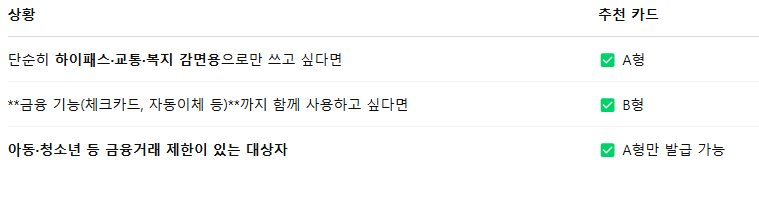 📌 A형은 교통혜택만, B형은 교통 + 결제 기능이 있는 카드입니다.