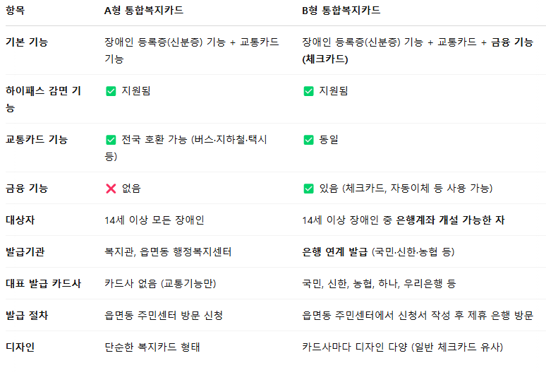 A형과 B형, 그리고 일반 복지카드의 차이를 정확히 알고, 본인에게 가장 맞는 형태로 신청해보세요!